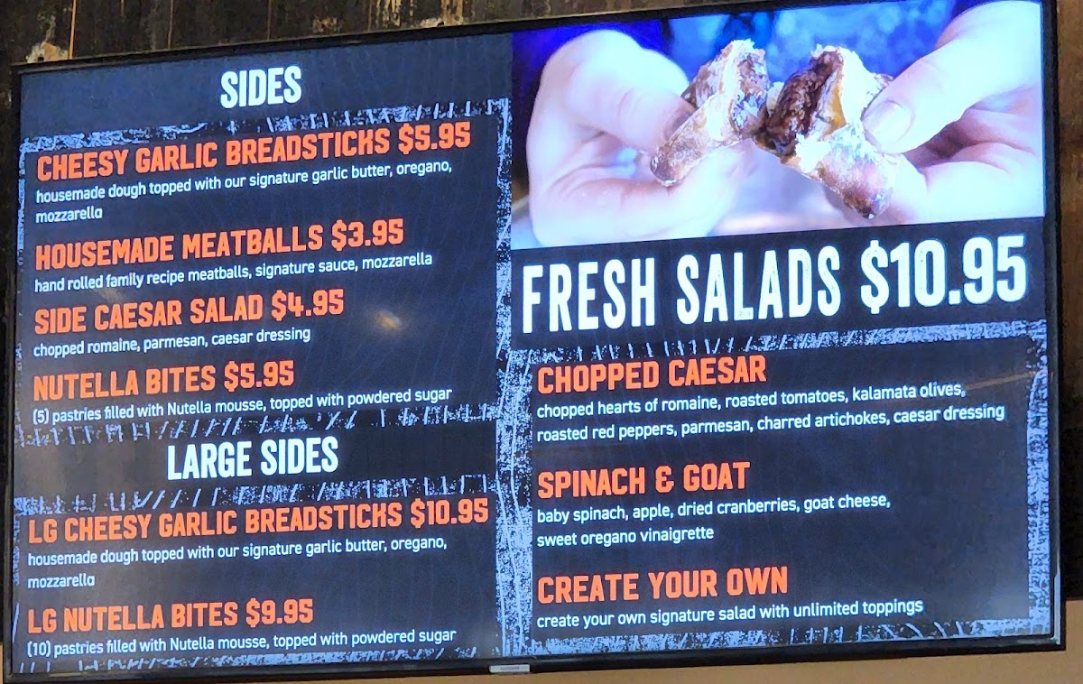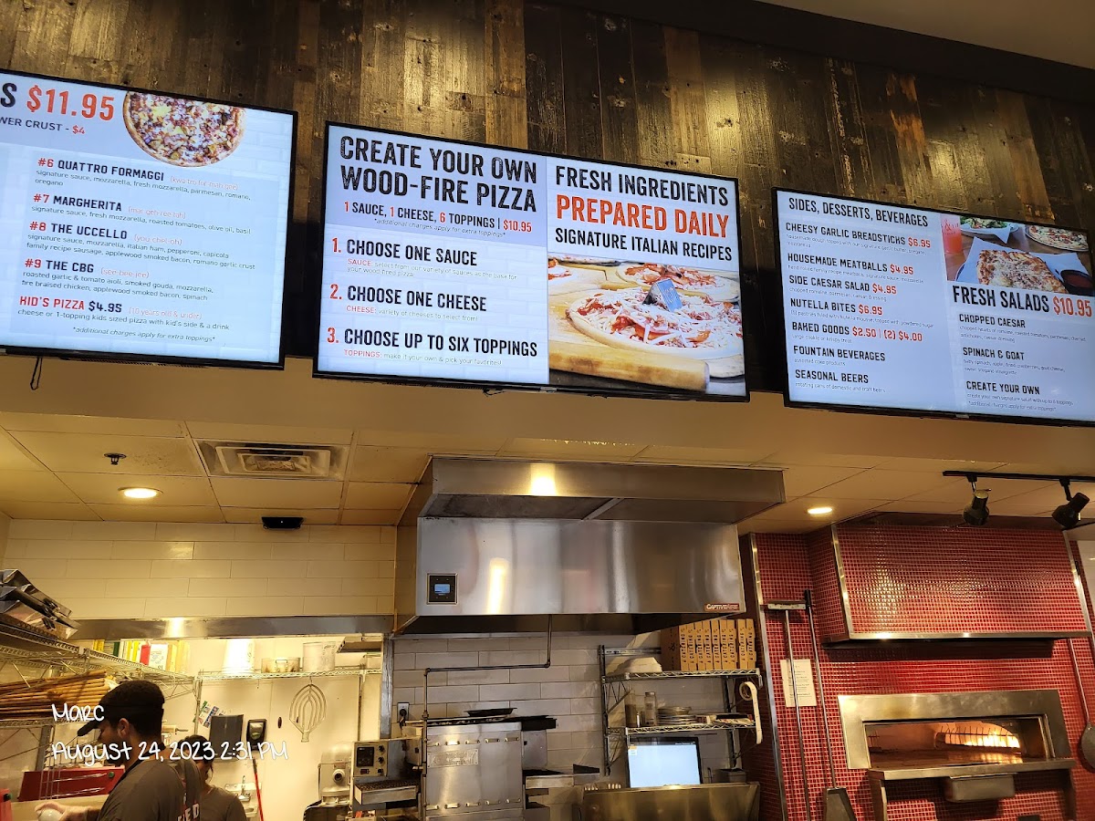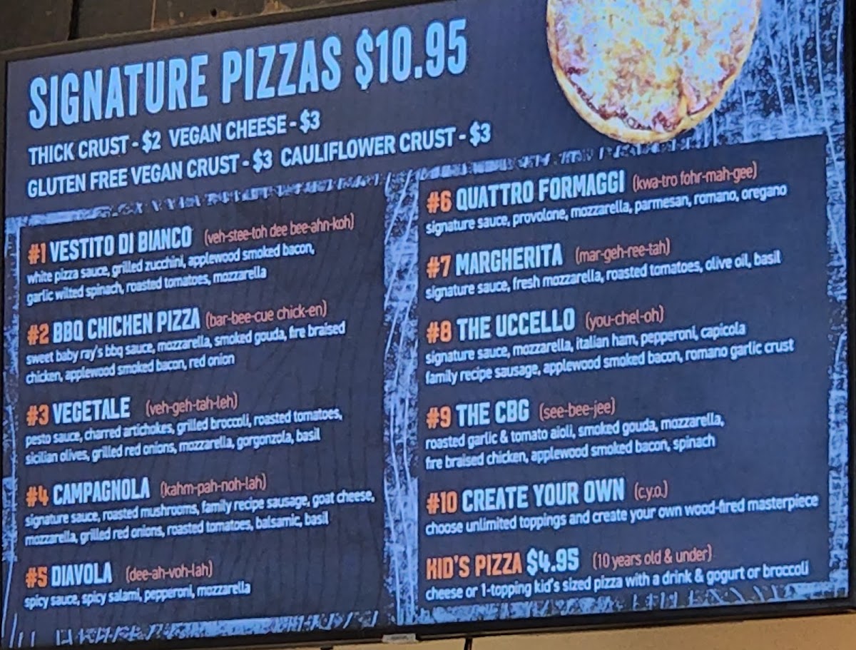 Salads like the Chopped Caesar and Spinach & Goat showcase fresh ingredients and bold flavors, each priced at $11.95. The inviting atmosphere, friendly staff, and unique touches like gluten-free options and various crusts enhance the dining experience.